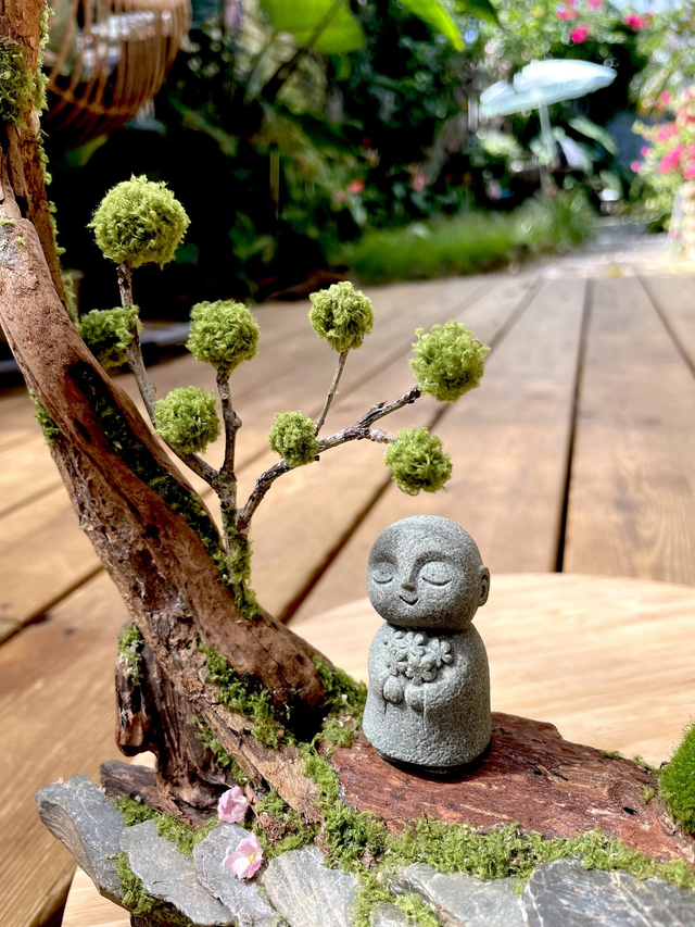 Création lumineuse au dos (à pile), réalisée avec du bois flotté, le cercle est entièrement recouvert d'écorce. Un adorable petit bouddha en résine de pierre, ainsi que la petite lanterne viennent apporter une touche très zen à cette création.