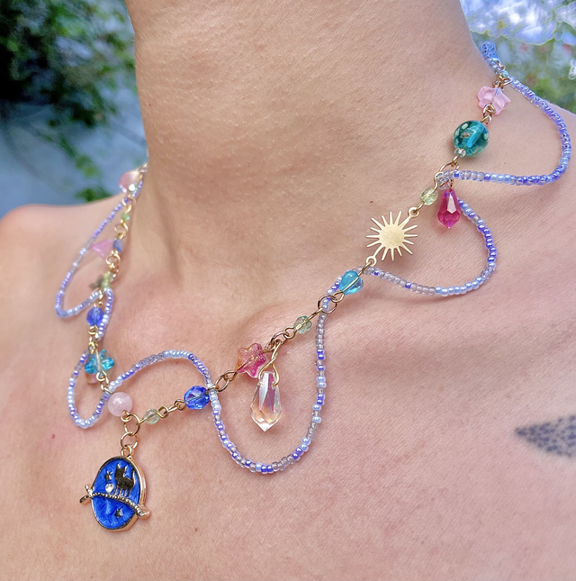 Naissance d'une magie mère - fille, voici " Promenade de minuit ", un collier réalisé à 4 mains, imaginé avec ma fille Jade. Tissé de lumière et de poésie, de déclinâtes perles en verre s'entrelacent de breloques étoilées.