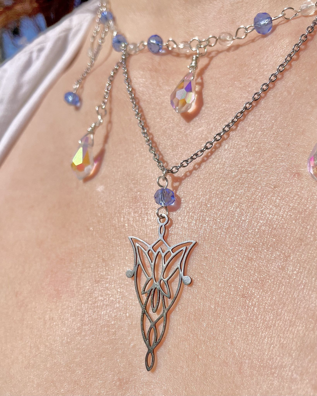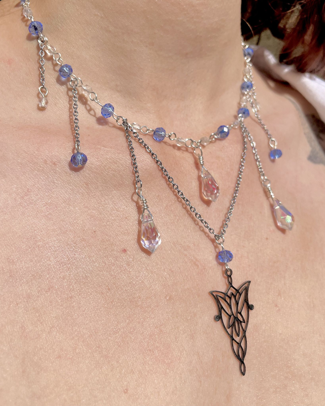 Un collier elfique aux reflets enchanteurs, où les perles de verre et de cristal se mêlent à la lumière.