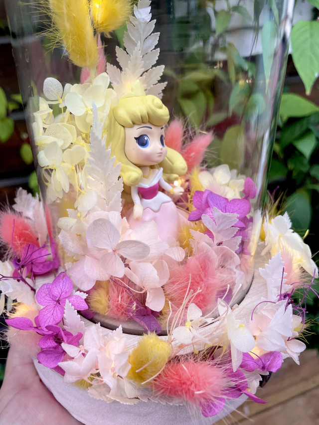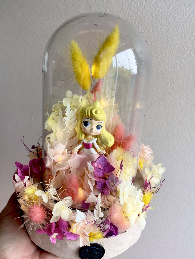 ✨👸🌸 « Rosée d’Or et lumière d’Aurore » Sous l’éclat d’une douce lumière, se dévoile la silhouette délicate de la princesse Aurore. Entourée des fleurs roses et jaunes, chaque pétale semble danser autour d’elle. Cette œuvre incarne la magie et l’élégance d’un rêve éveillé, où la lumière et la nature s’unissent pour offrir un instant de pure enchantement . Cette création est composée de fleurs naturelles stabilisées et s’illumine grâce à une guirlande led à pile